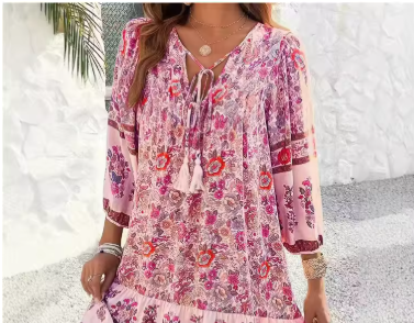 فستان فضفاض مطبوع غير رسمي للنساء، فستان عصري بأكمام طويلة وياقة على شكل V مع أربطة، فساتين كلاسيكية للسيدات، ملابس نسائية بوهيمية للعطلات