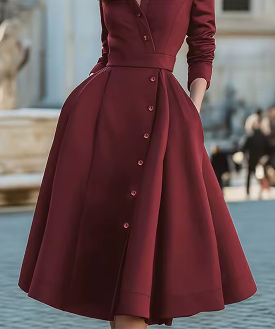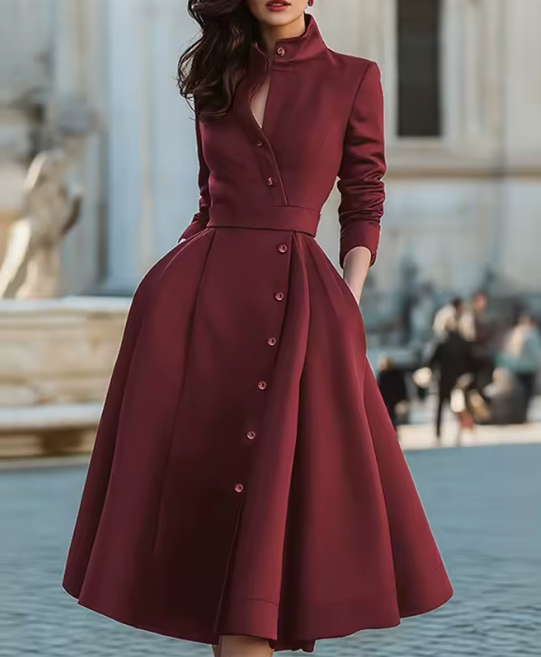 فستان نسائي عالي الخصر بحزام وياقة واقفة على شكل حرف a للحفلات وأكمام طويلة وأزرار بلون سادة فساتين سهرة متوسطة الطول للزفاف